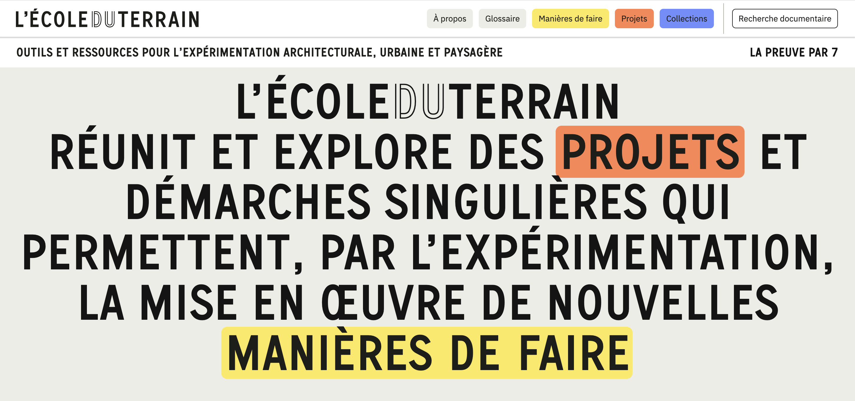 La Preuve par 7 accompagne ces projets et ces manières de faire. Elle documente en parallèle ces différentes expérimentations dans le centre de ressources l’École du Terrain, afin de les transmettre et de les inscrire dans les pratiques, dans les politiques publiques et dans le droit.