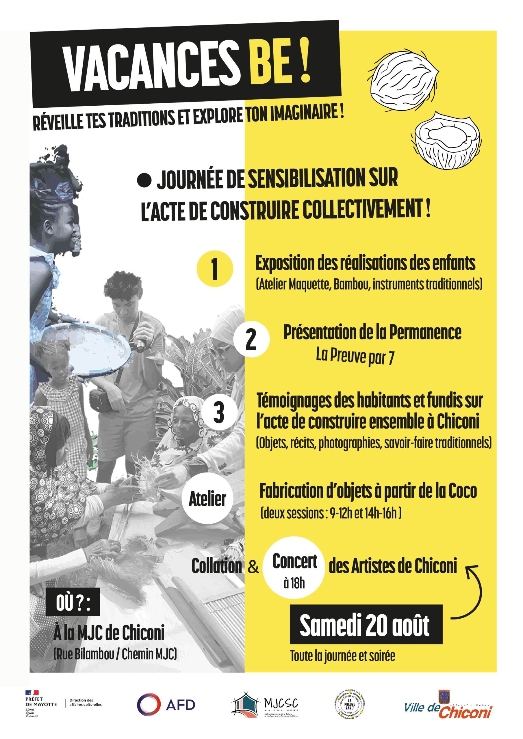 Le samedi 20 août prochain, un temps fort culturel aura lieu à la MJC de Chiconi dans le cadre de la permanence. Durant cette journée, plusieurs actions seront menées avec une thématique commune : les récits autour de l’acte de construire collectivement.